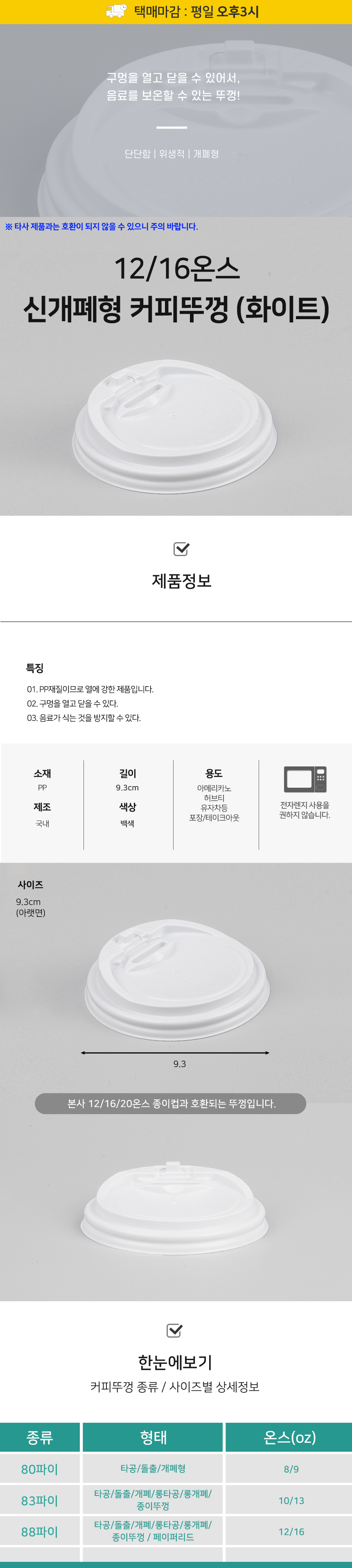 12/16온스 신개폐형 커피뚜껑 화이트 1박스(1000개)