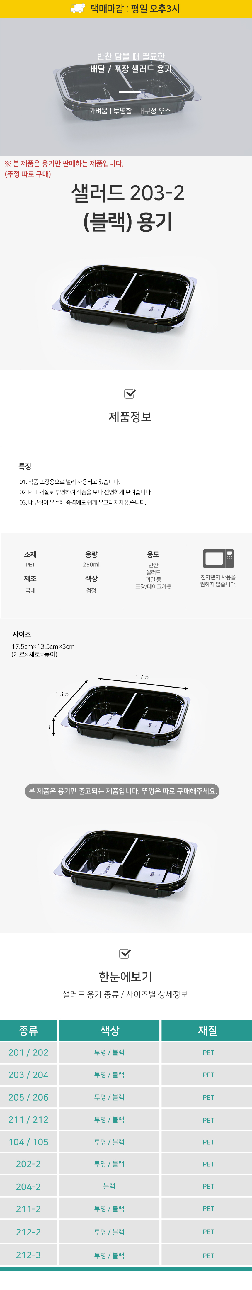 203-2 샐러드 2칸 용기 블랙 1박스(800개) 사각용기 배달용기