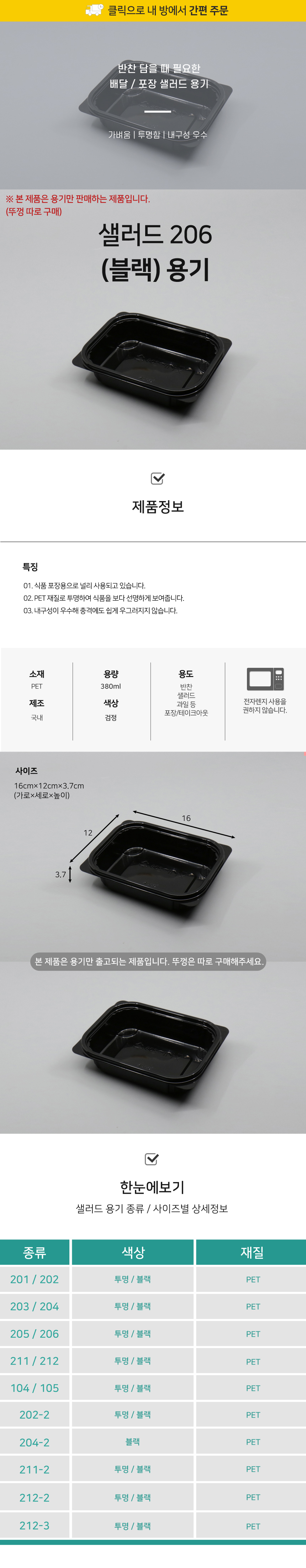 206 샐러드 용기 블랙 1박스(800개) 사각용기 배달용기