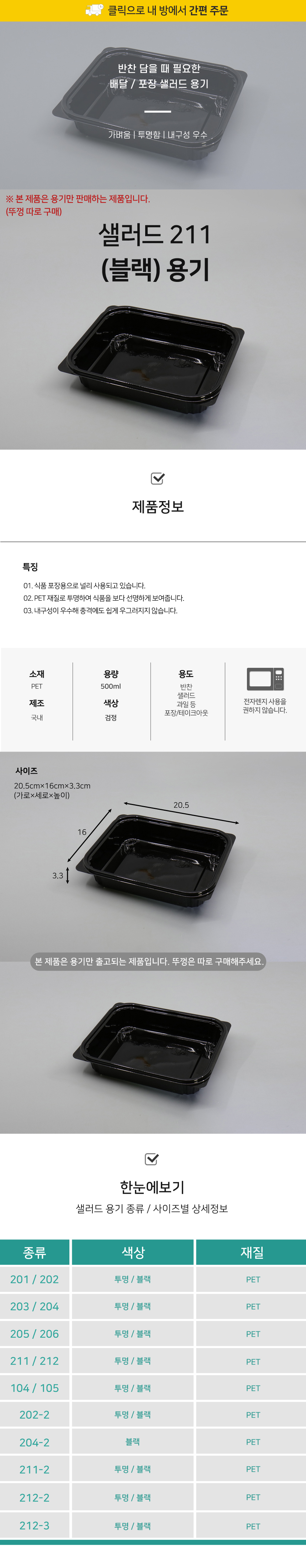 211 샐러드 용기 블랙 1박스(600개) 사각용기 배달용기