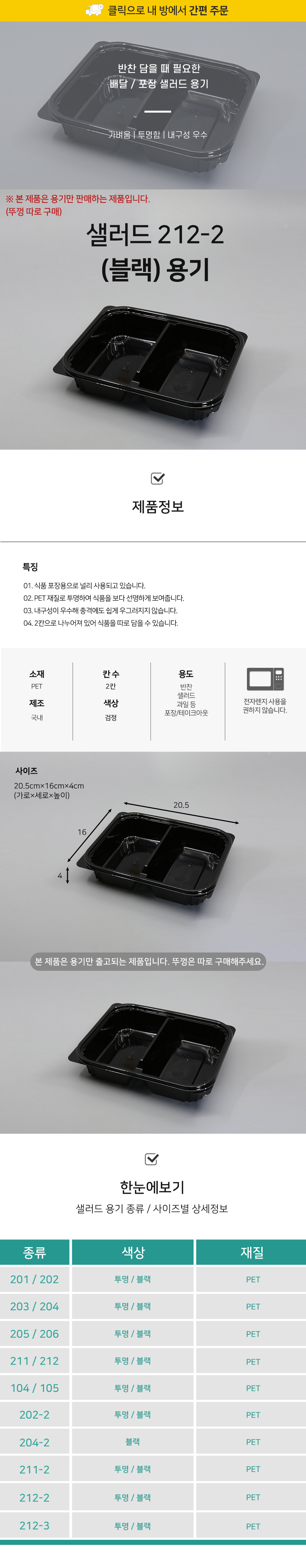 212-2 샐러드 2칸 용기 블랙 1박스(600개) 사각용기 배달용기