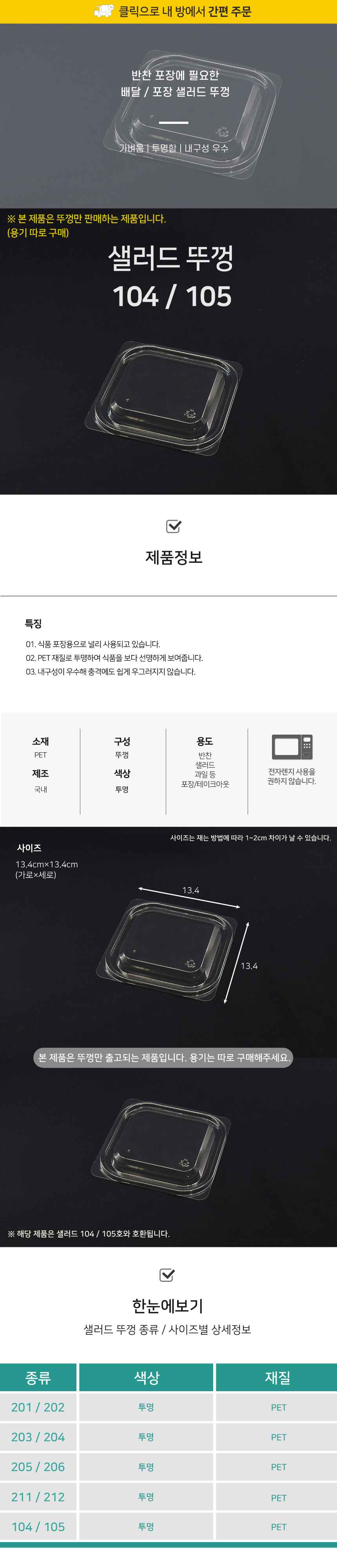 샐러드용기 뚜껑(104/105 전용) 투명 1박스(900개) 사각용기 배달용기