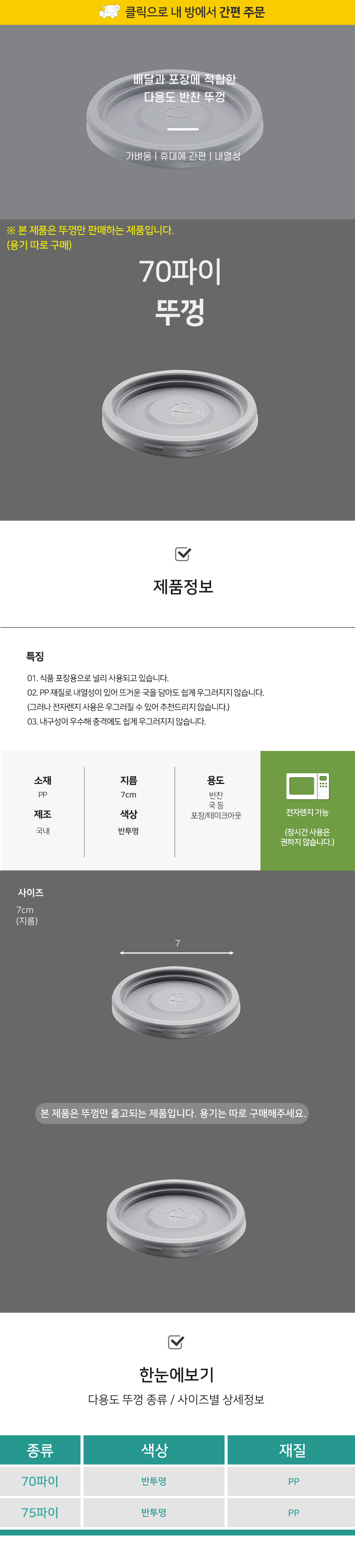 70파이 뚜껑(반투명) 1박스(3000개) 장국용기 소스용기