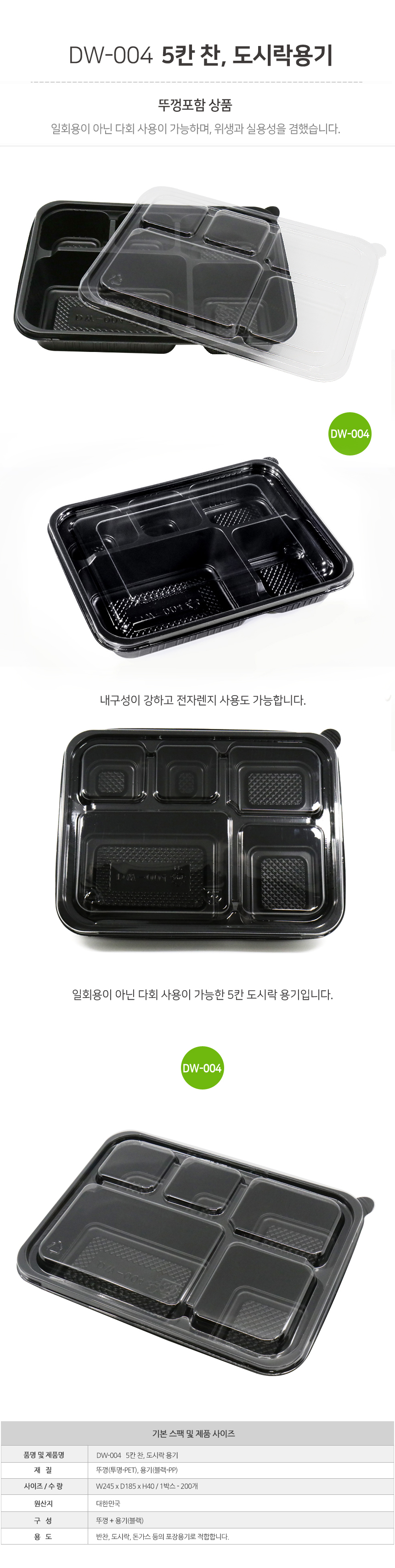 도시락 5칸+뚜껑 DW-004 1박스(200개) 도시락용기 돈까스용기