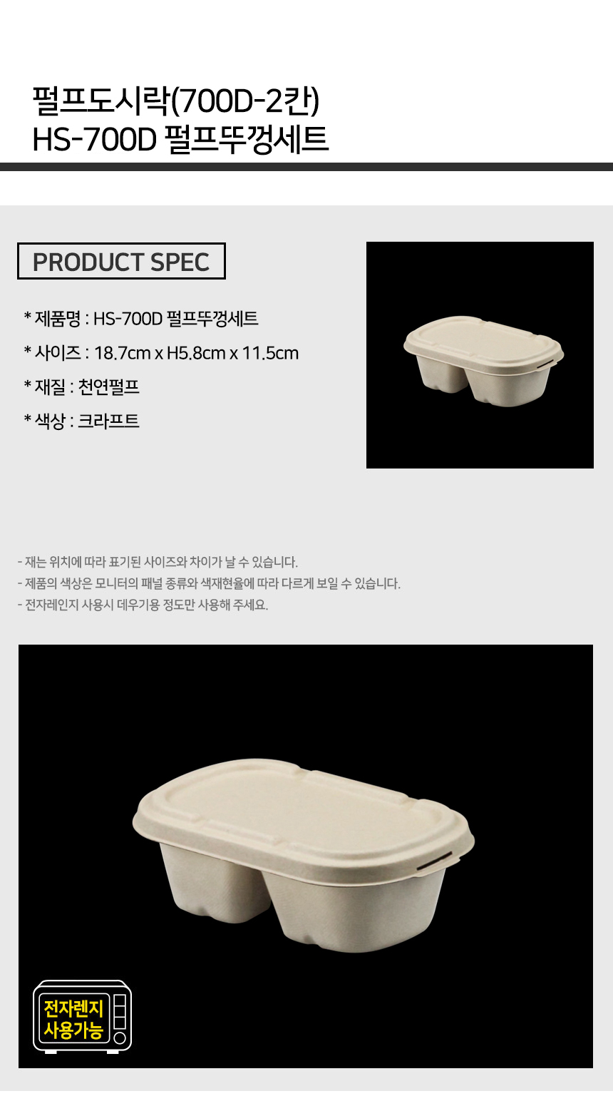 펄프 도시락 700D 2칸 용기+뚜껑 세트 1박스 (500EA)