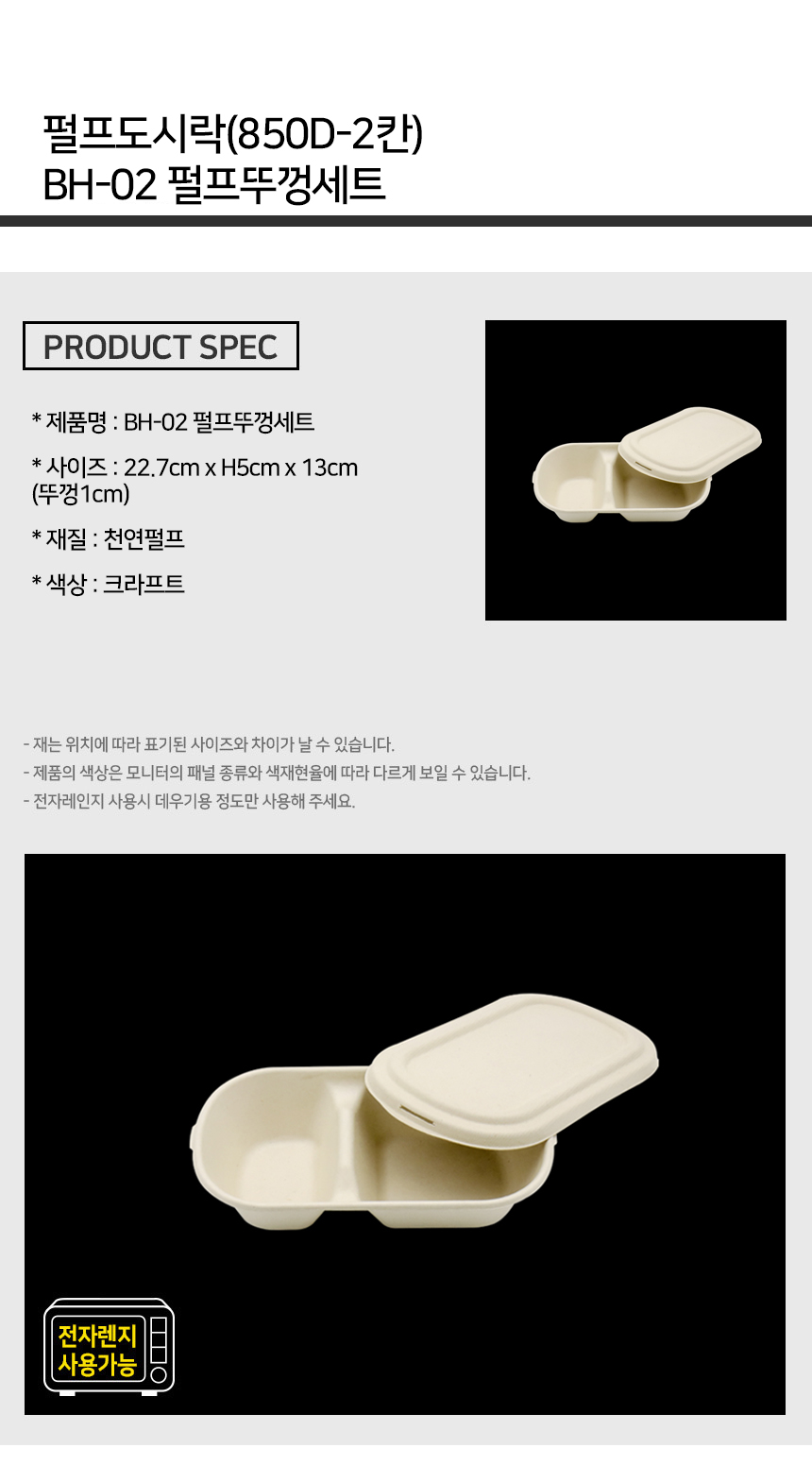 펄프 도시락 850D 2칸 용기+뚜껑 세트 1박스 (500EA)