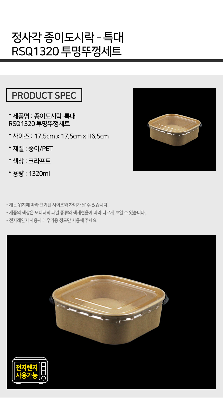 정사각 종이도시락+투명뚜껑 세트 특대 RSQ1320 1박스(300개)