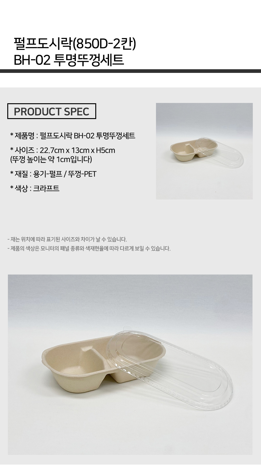 펄프도시락 2칸+투명뚜껑 세트 850D 1박스(500개)