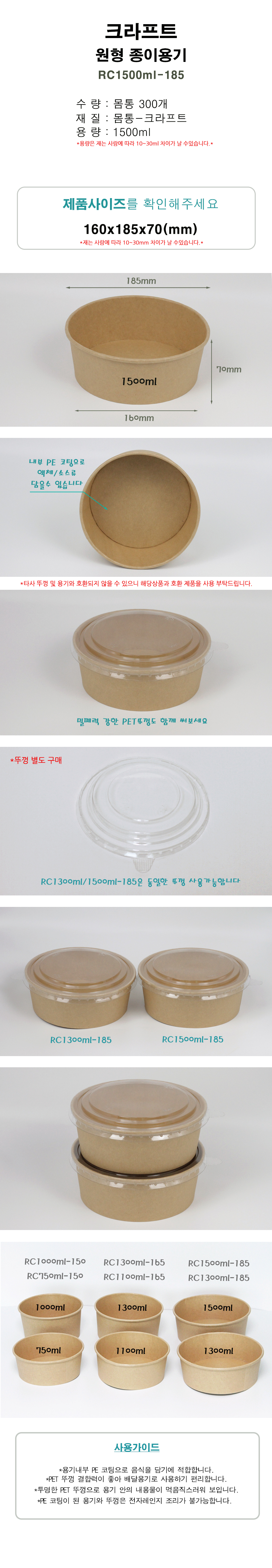 원형 종이용기(크라프트) RC-1500ml 185Φ 1박스(300개)