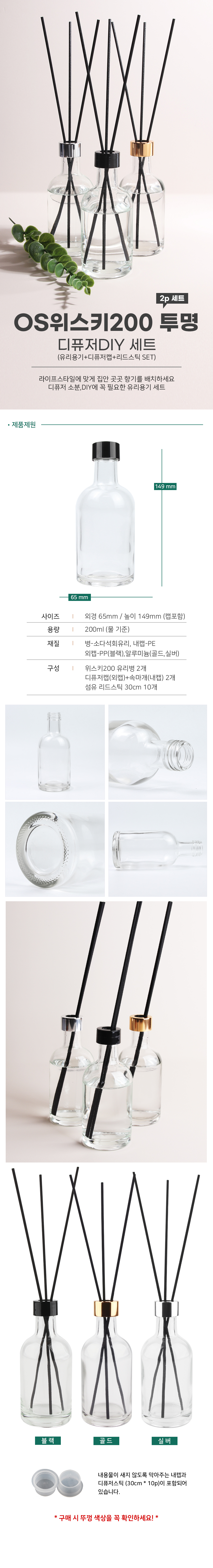 OS위스키200 투명 유리병 2P + 리드스틱 10P 디퓨저 DIY 소분용기 세트