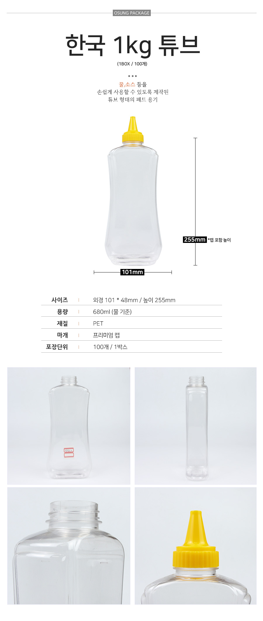 한국 1kg 페트튜브 1박스(100개) 꿀튜브 꿀용기
