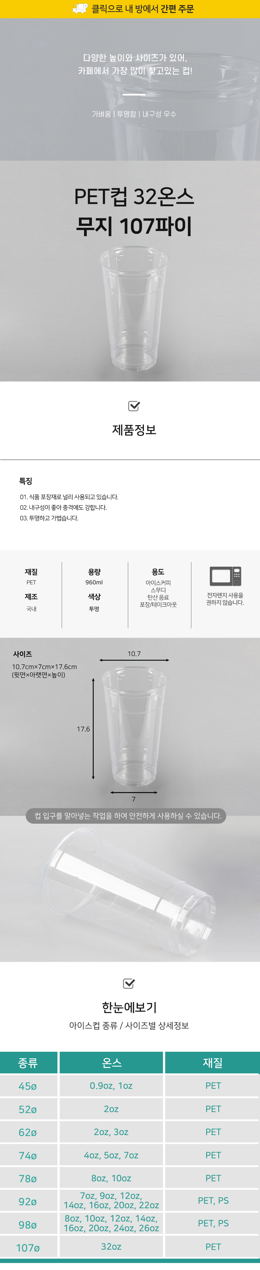 32온스 투명 대용량 페트컵 107Φ 1박스(500개) 테이크아웃컵 아이스컵
