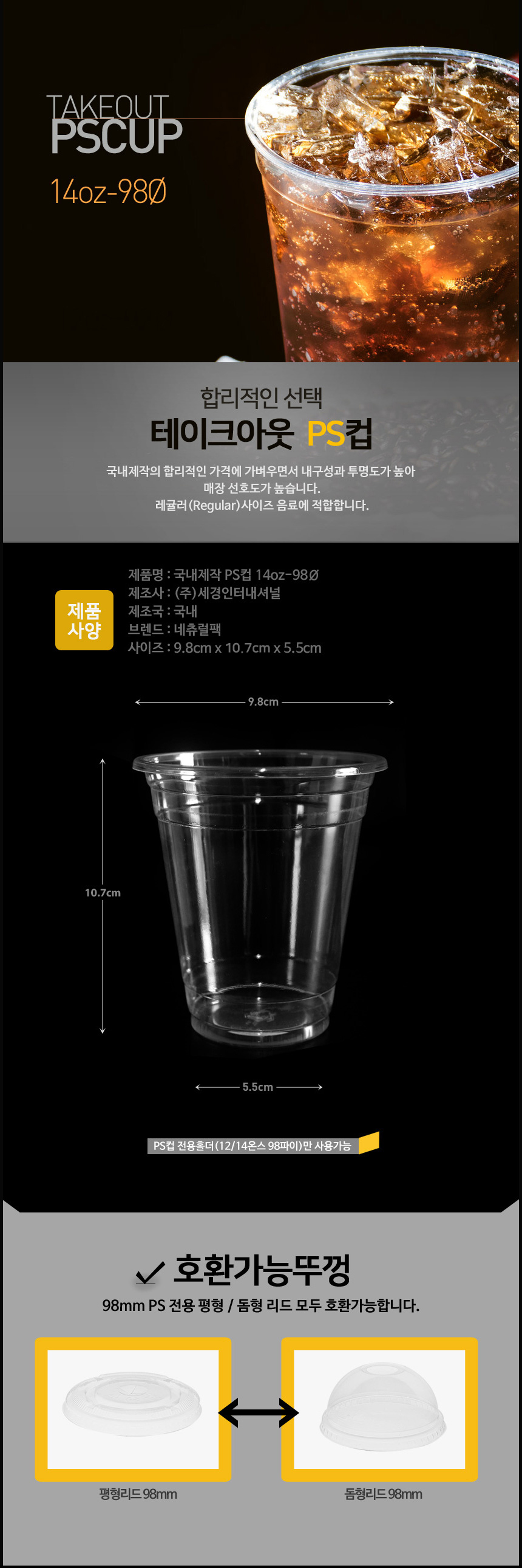 14온스 투명 PS컵 98Φ 1박스(1000개) 테이크아웃컵 아이스컵