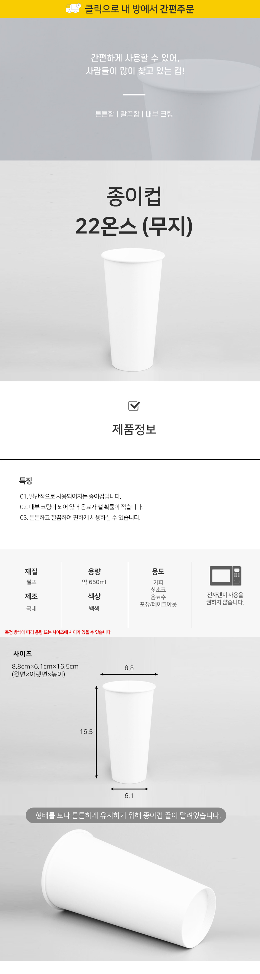22온스 무지 종이컵 테이크아웃컵 1박스(1000개)